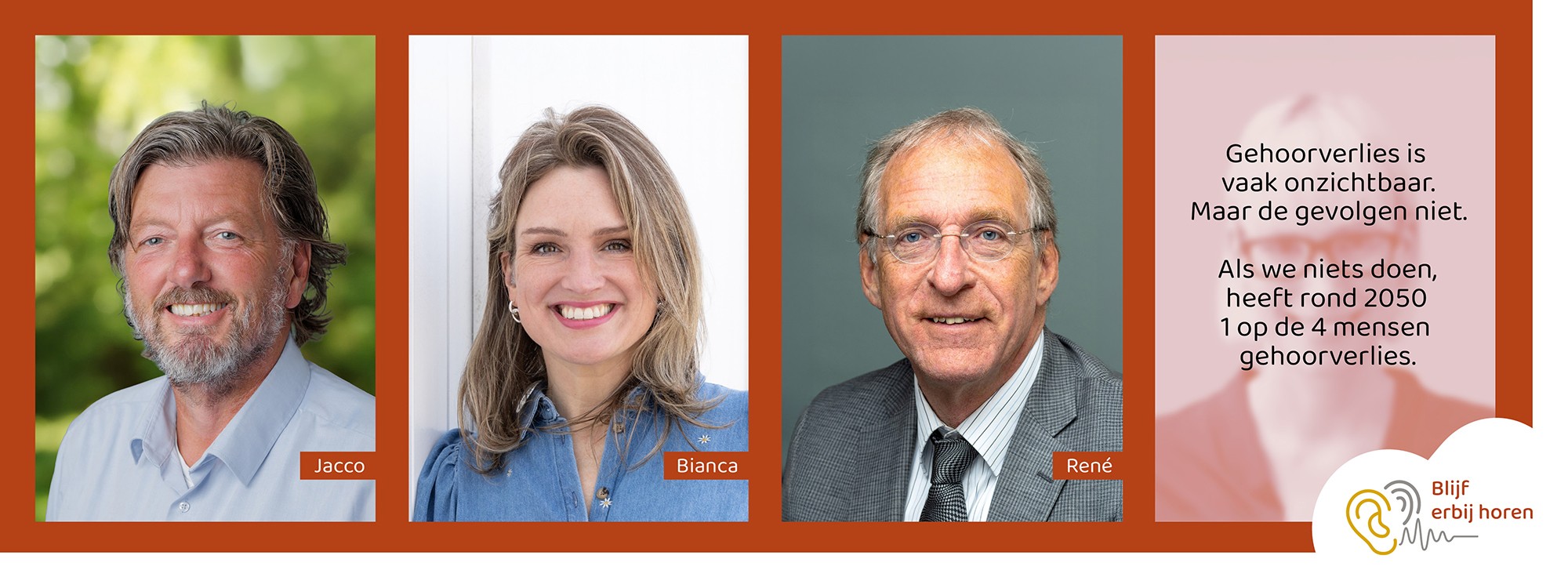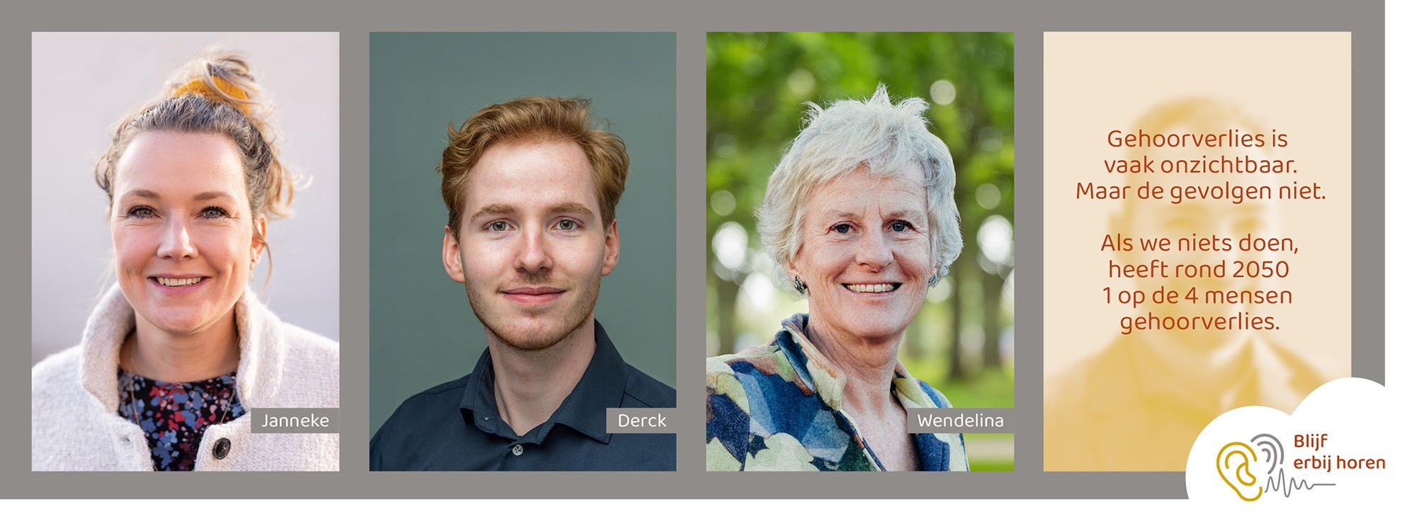 In de campagne 'Blijf erbij horen' zie je steeds drie gezichten met een persoonlijk verhaal. Het vierde portret blijft leeg. Het staat symbool voor iemand die in de toekomst gehoorverlies krijgt. Misschien iemand die je kent. Je partner, je vader of moeder, je collega, je vriend. Of misschien jezelf.