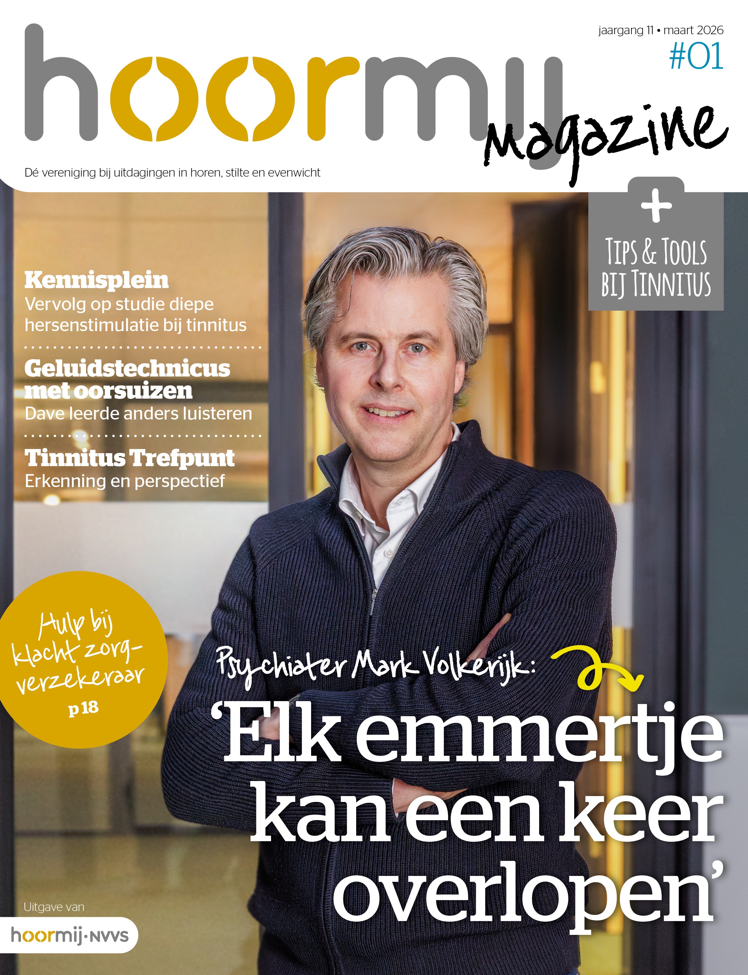 Het maartnummer van Hoormij Magazine is verschenen, een nummer met speciale aandacht voor tinnitus. Met boeiende interviews, onder meer met onze medisch adviseur, psychiater Mark Volkerijk en met diverse ervaringsdeskundigen. In het hart van het magazine bieden we Tips & Tools voor het omgaan met tinnitus. En in de rubriek Kennisplein vertelt neuroloog/klinisch neurofysioloog Mark Janssen over het onderzoek naar diepe hersenstimulatie bij mensen met ernstige tinnitus.