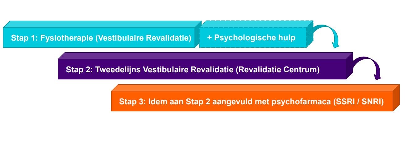 De eerste stap: “Vestibulaire revalidatie is een vorm van gespecialiseerde fysiotherapie die de klachten van duizeligheid en balans vermindert bij 53 tot 79% van de patiënten. Daarmee nemen vaak ook gevoelens van angst en somberheid af. Het advies voor het beste resultaat is om de behandeling drie tot zes maanden te vol te houden. Als er sprake is van veel angst- en stemmingsklachten is het raadzaam om het behandeltraject te versterken met psychologische hulp in de vorm van cognitieve gedragstherapie. Circa 60-90% van de patiënten ervaart een afname van spanningsklachten omtrent de duizeligheid na therapie. Het effect is afhankelijk van factoren als: hoe snel er met de therapie wordt gestart na het ontstaan van de klachten en de mate van gevoelens van angst en spanning.
